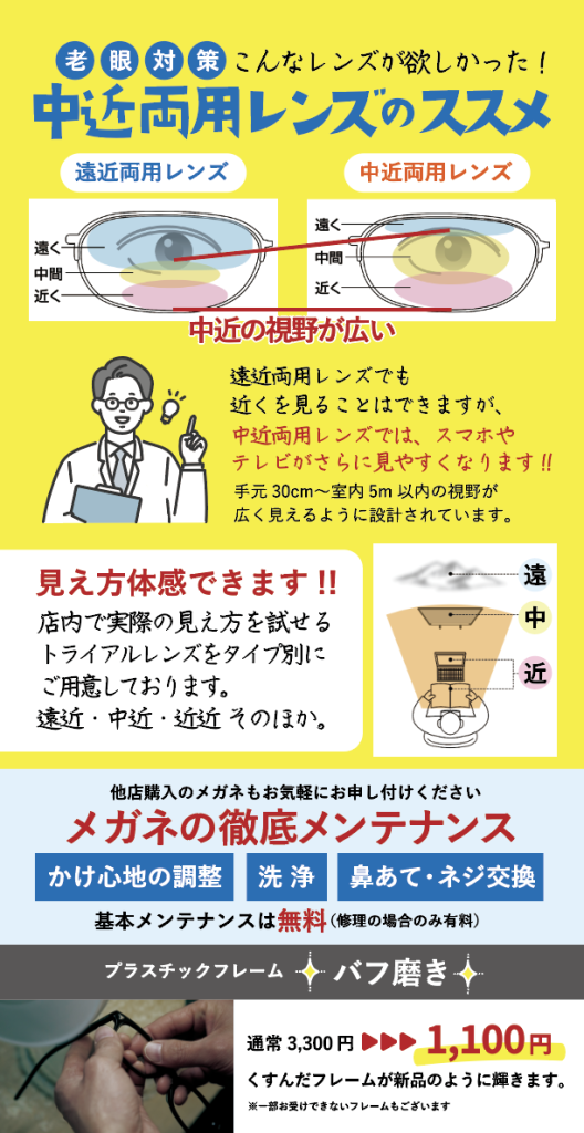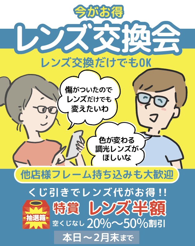 度数を変えたい、傷ついたレンズを交換したいなど、お気軽にご相談ください。